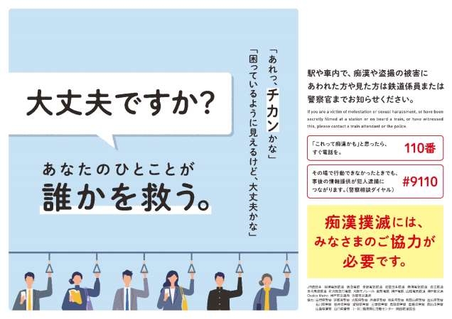 2.実施趣旨 各鉄道事業者では、駅構内や電車内での痴漢対策として、各府県の警察と連携して警戒や啓発に取り組んでおりますが、継続的に被害が発生しており、深刻な社会問題であると考えています。そこで、更なる痴漢対策の一つとして、関西の鉄道事業者が共同で作成したポスターを通じて、被害を見かけた際の声かけや、鉄道係員・警察官への通報等