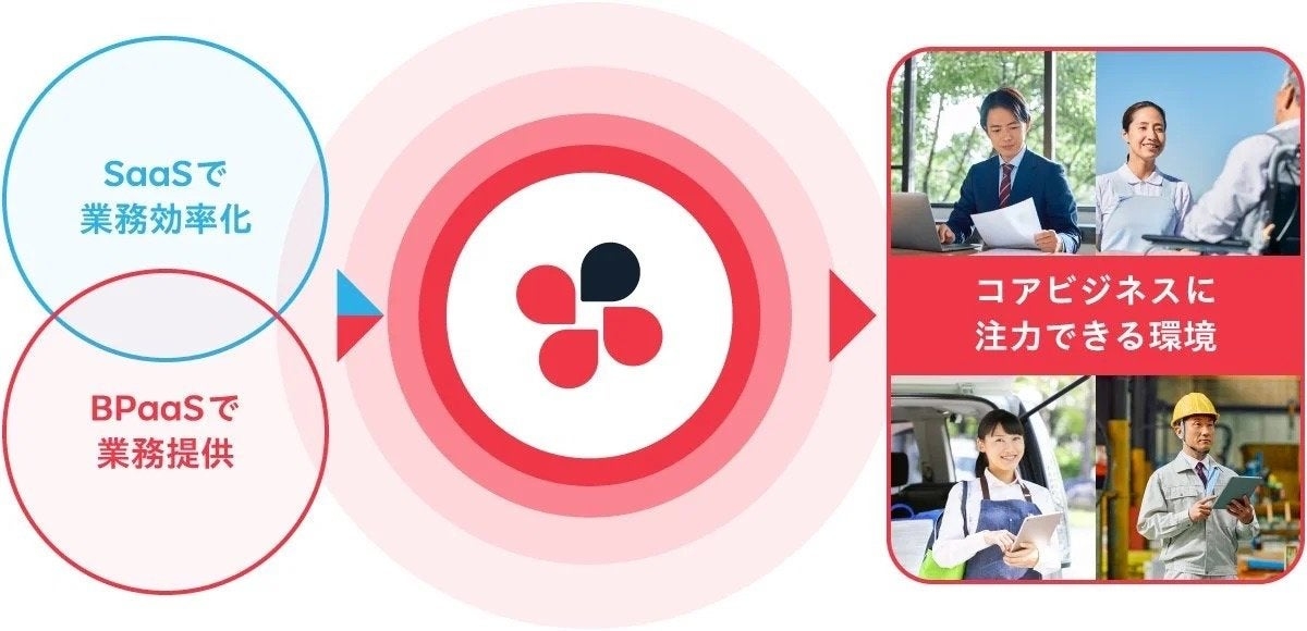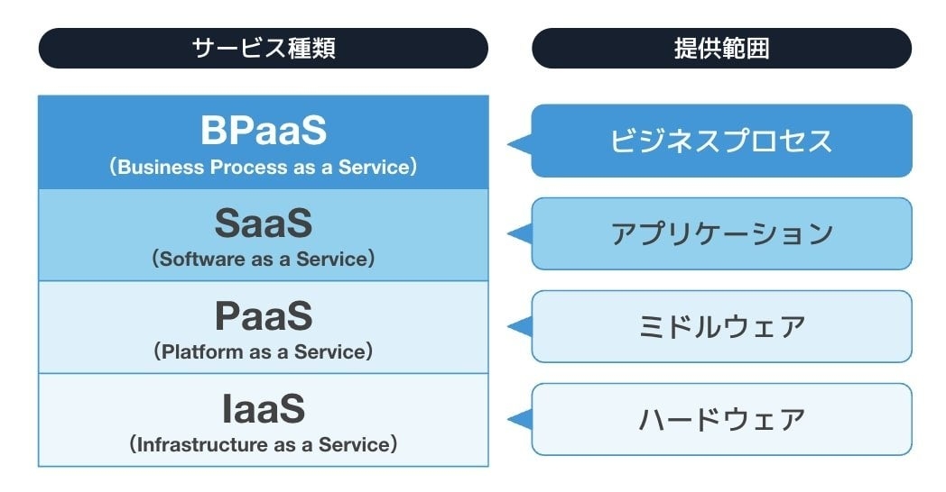 SaaS(Software as a Service)のようにソフトウェアを提供するのではなく、ビジネスプロセス(業務プロセス)そのものを提供するサービスです。 サービスの裏側では、複数のSaaSやITツールを利用し業務効率化した上でサービス提供していることから、ITツールへの知見やノウハウの少ない企業でも、間接的にSaaSを利用でき恩恵を受けられるサービスとして注目されています。