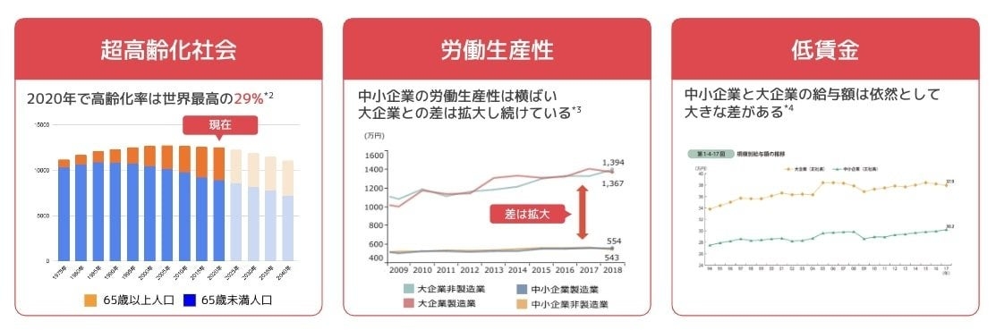 少子高齢化が進む日本において*2、社会福祉を支え国際競争力を上げるためには、労働生産性の向上が最大の焦点です。特に、労働人口の68.8%を占める中小企業において、労働生産性は長年伸び悩んでおり*3、労働生産性の低さの根本原因となっています。比例して、中小企業の給与額は大企業と比較して低く*4、長らくこの差は埋まっていません。