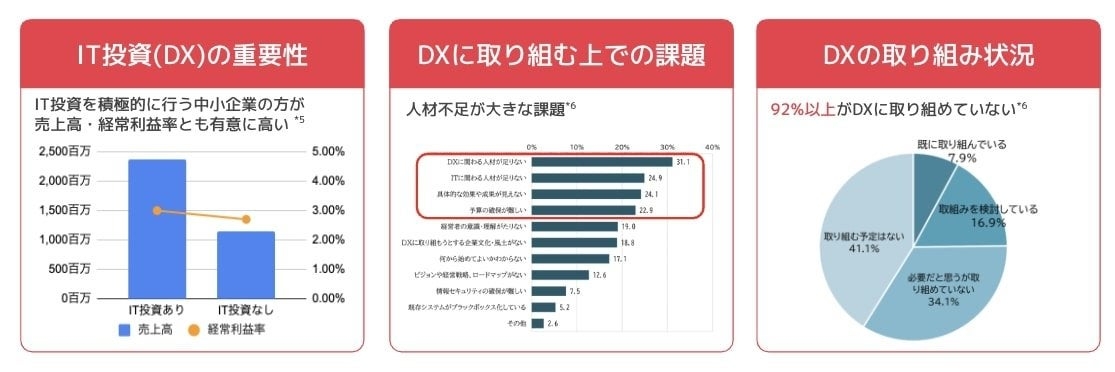 中小企業の労働生産性向上には、IT投資(DX)が重要である*5ことが分かっていますが、一方で、中小企業には適切な人材が少なく、DXに取り組む大きな課題となっています。その結果として、92%以上の中小企業がDXに取り組めていない状況にあります。*6