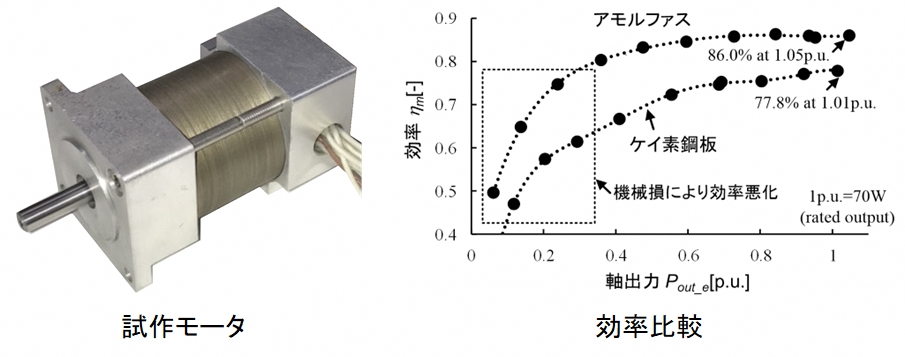 アモルファスコアを組み込んだSRMの効率は、ケイ素鋼板コアSRMに対し、50%負荷において8.9p.t.向上しました。さらに負荷10%から100%までの領域で90%前後であり、最大効率は90.9%を達成しました。