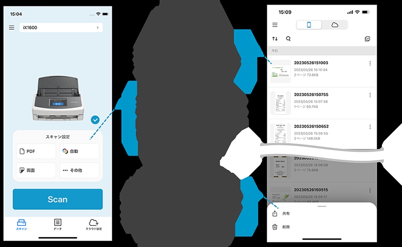 これまでのモバイル向けアプリ「ScanSnap Connect Application」と、スキャナーから直接クラウド連携できるサービスScanSnap Cloudの設定を行う「ScanSnap Cloudアプリ」の機能を統合。より使いやすい直感的なユーザーインターフェイスで、スキャンやクラウド設定を行えます。従来のモバイルアプリのスキャンデータは、モバイル版ScanSnap Homeに引継ぎ可能です。(注1)(従来のモバイルアプリは2024年8月頃に提供終了予定)