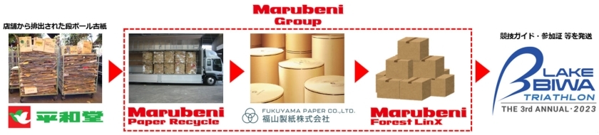 今回、地元企業である株式会社平和堂の店舗から排出された使用済段ボールを丸紅グループ3社で回収から、原料供給、段ボールメーカーの手配までグループ内で一貫管理し、段ボールケースを供給。この段ボールケースは2023年10月1日に開催されるLAKE BIWA TRIATHLON大会参加者への競技ガイドなどの書類や地域参加賞等の事前発送に使用されました。