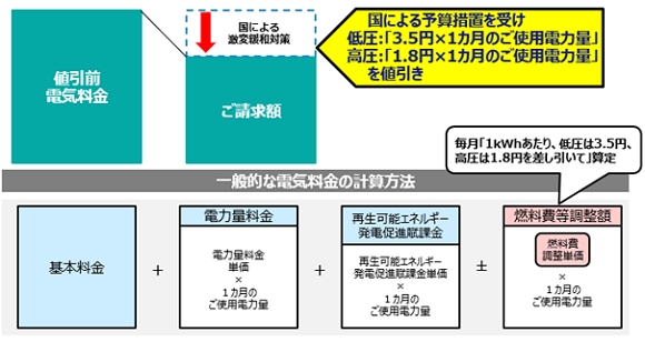 | ※2 | 平均燃料価格で算定した調整単価から、低圧は1キロワット時につき2023年2月分から9月分は7.0円(税込み)、2023年10月分から2024年1月分は3.5円(税込み)を、高圧は1キロワット時につき2023年2月分から9月分は3.5円(税込み)、2023年10月分から2024年1月分は1.8円(税込み)を差し引く特別措置。 |