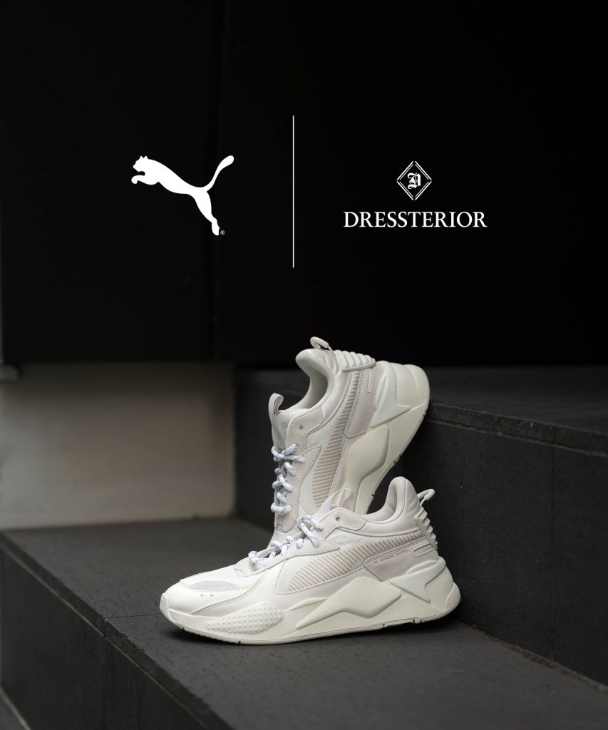 今回ドレステリアでは、スタイリッシュかつ機能的なPUMA RS-Xシリーズのコラボアイテムを展開。グレイッシュなホワイトカラーをベースに、ニュアンスの違うホワイトをバランスよく配色したソリッドなワントーンシューズを別注オーダーしました。