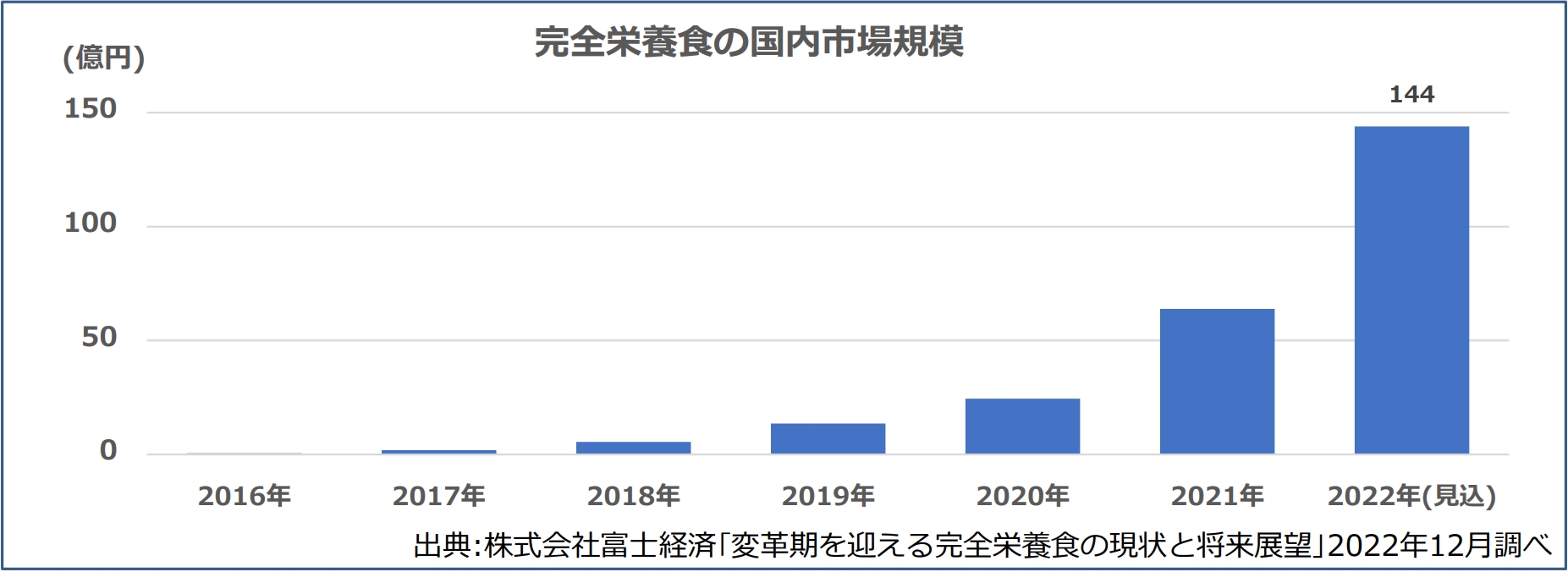 2022年の完全栄養食(1食で必要な栄養素がバランスよく摂れる食品)の国内市場規模は、食事に対する健康意識と簡便性の高い食品需要の高まりから、約144億円まで拡大しています(下図参照)。