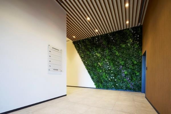 環境面では、CASBEE認証Aランク、BELS認証5☆、最高ランクの「ZEB」認証を取得しています。屋上に太陽光発電システムを導入し、電力の一部を館内に供給、テナントの再生可能エネルギーの利用が可能です。また、エントランスの壁には、調湿効果のある卵の殻を再利用した、エッグウォールや、素材本来の風合いを持つ使用済みコーヒー豆を再利用したリサイクルボードなど、リサイクル素材を活用しています。