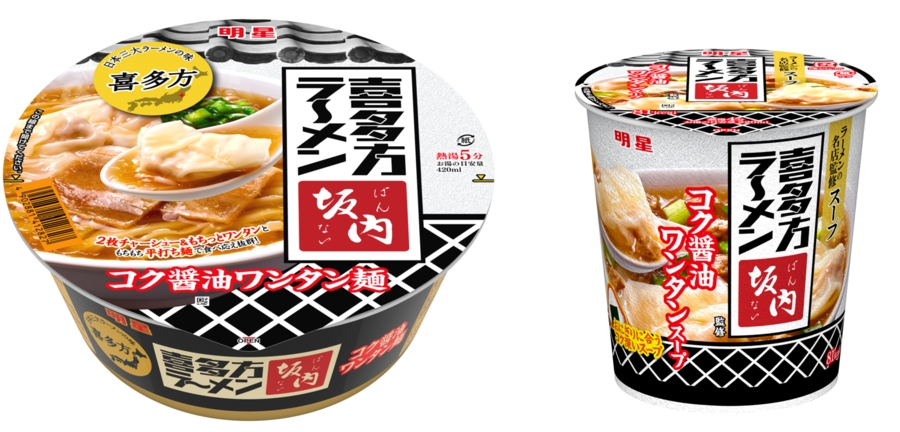 「明星 喜多方ラーメン坂内 コク醤油ワンタン麺」「明星 喜多方ラーメン坂内監修 コク醤油ワンタンスープ」(2月10日発売)