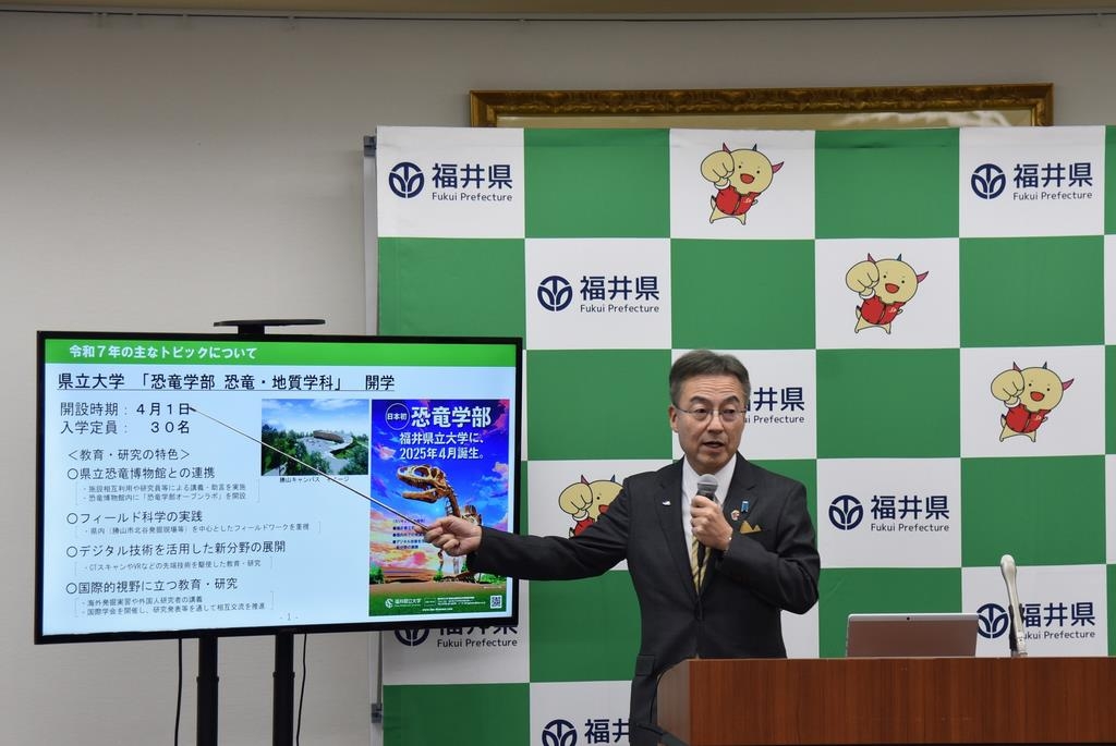 今年のトピックスですが、まず一つは、4月に県立大学恐竜学部がいよいよ開学するということです。恐竜博物館のところに勝山キャンパスができるのは来年の4月になりますが、学部としては4月から永平寺キャンパスで出来上がるということです。入学定員30名で、先行して行った総合選抜型試験も10倍という大変な人気を得ています。特徴といたしましては、なんといっても世界三大恐竜博物館、福井県立恐竜博物館と連携を強化するということでして、相互に施設を利用する。また、この大学で得られた新たな知見を恐竜学部オープンラボという形で発表ができるようにしていくこともできるかと思いますし、フィールドを重視したいということで、県内の、もちろん勝山での恐竜発掘ということもありますが、世界でいろいろな恐竜の発掘などにも協力をしていくといったこともできると思っています。また、デジタル技術も非常に進んできていまして、CTなどを使うと、脳の構造・大きさなどもすぐにわかってくる。そうすると、その恐竜の特性も見えてくる。ティラノサウルスなどは、顎の骨の神経の穴がちゃんとしっかりしているというところから見ると、非常に神経が行き届いているから、子どもなどくわえて歩いたのではないかという説が出てくるとか。そういった意味でも、新しい技術は活かしていくということです。それから国際協力ということで、今申し上げた海外での発掘の協力もありますし、国際学会も福井で開けるようにしていく。こういうようなことが非常に、可能性が広がってくる。福井にとって大きなブランド力を発揮できる大学になるということになると思います。