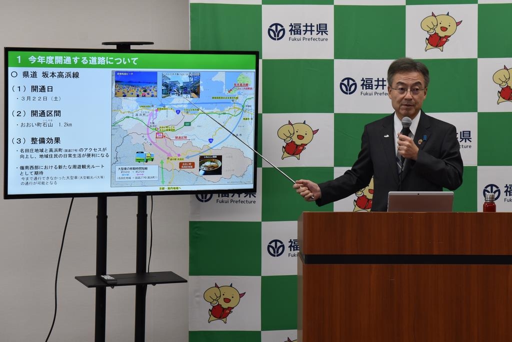 3点お話をさせていただきます。いずれも道路の開通になります。最初が、県道の坂本高浜線で名田庄から高浜町に抜けていくこの道路のところの、おおい町石山の区間が完成しますので、3月22日に開通するということです。今も道路はありますが、ここに行っていただいている方はお分かりのとおり、非常にカーブも急で、狭いですから大型の車は行き来ができない、通れないということで観光バスも小浜市に入ってぐるっと回っていたものが近くなって、安全になるわけです。観光バスも通れますので、ぐるっと一周するルートや、こちらの方から行くルートもあり、ここが西の鯖街道になりますので、南のところが、こっちからのルートもできることは非常に便利と考えています。時間も、今まで大型の場合はぐるっと50分ぐらいかかっていたところが25分で済みます。