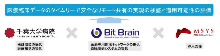 この解決には「院外の放射線科医による遠隔画像診断」の実施が有効と考えています。その検証を実施するため、医療専用閉域ネットワークおよびシステム基盤の提供および遠隔読影システムの提供を行うビットブレインと、千葉県民620万人の診療を広く対応し、症例数・疾患のバリエーションが極めて豊富であり、放射線科医・放射線技師・看護師からなる画像診断センターを有する千葉大学病院と、千葉大学病院の導入支援を行うMSYSが連携し、「医療専用閉域ネットワークの整備と遠隔読影システムの利用」の検証と適用可能性の評価を実施します。