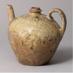 【古瀬戸水注(こせとすいちゅう)、至極(しごく)の名品(めいひん)】 中世前期の瀬戸水注は、中国陶磁の青白磁をモデルとして制作されましたが、文様構成には日本独自の意匠も採用されています。 胴央に窓絵状の丸文と花文を中心として蕨手文を配し、口頸の基部には剣先文(けんさきもん)を巡らせています。灰釉はよく溶けて黄緑色に発色し、淡い褐色の器肌に映えています。
