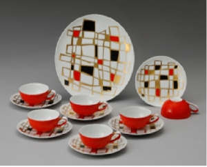 【昭和のモダンなお茶の時間を演出】 デザイン案を元に手描き装飾を担当したのは、愛知県瀬戸市出身の画家・太田龍一(おおたりゅういち)(1915-1994)。 三郷陶器は愛知を代表する高級陶磁器メーカーであるにもかかわらず、当館では1991年作を1件収蔵しているのみでした。昭和30~40年代の三郷陶器による限定商品として捜し求めていたものです。 |