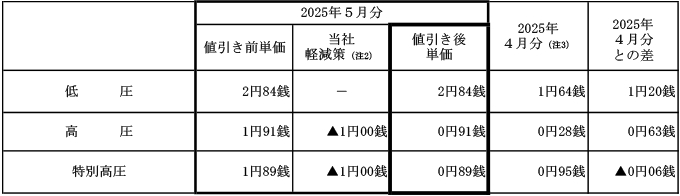 また、当社の電気料金の負担軽減策により、2025年4月分から2026年3月分(2025年3月使用分から2026年2月使用分(注) )の燃料費調整単価を高圧供給および特別高圧供給のお客さまにつきましては、それぞれ1円00銭/kWh値引きすることといたします。