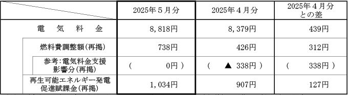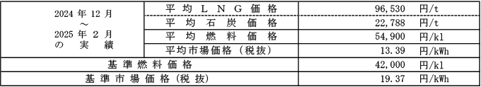 本日、電気料金の燃料費調整に用いる貿易統計値が公表されたことにともない、2024年12月~2025年2月の平均燃料価格が確定しました。この結果、当社は、2025年5月分の電気料金につきまして、下記のとおり燃料費調整を実施いたします。