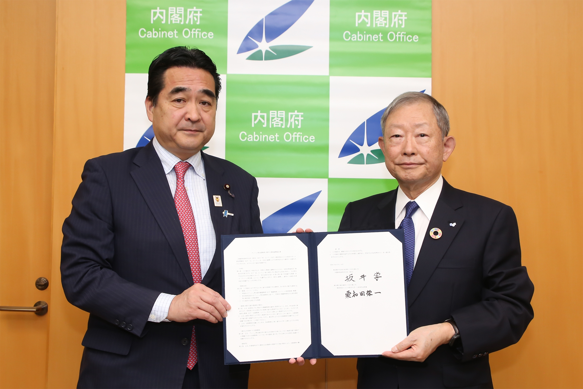 (左から) 坂井学 内閣府特命担当大臣(防災)、SGH防災サポート財団 理事長 栗和田榮一