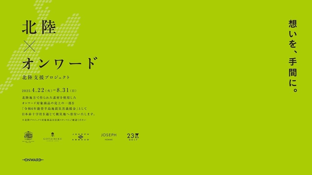 株式会社オンワード樫山(本社:東京都中央区 代表取締役社長:保元 道宣)のメンズブランドは、素材の産地を通して北陸を支援するプロジェクト「北陸×オンワード ~想いを、手間に~」を、2025年4月22日(火)から8月31日(日)までの期間、全国の店舗および公式ファッション通販サイト「オンワード・クローゼット」にて実施します。