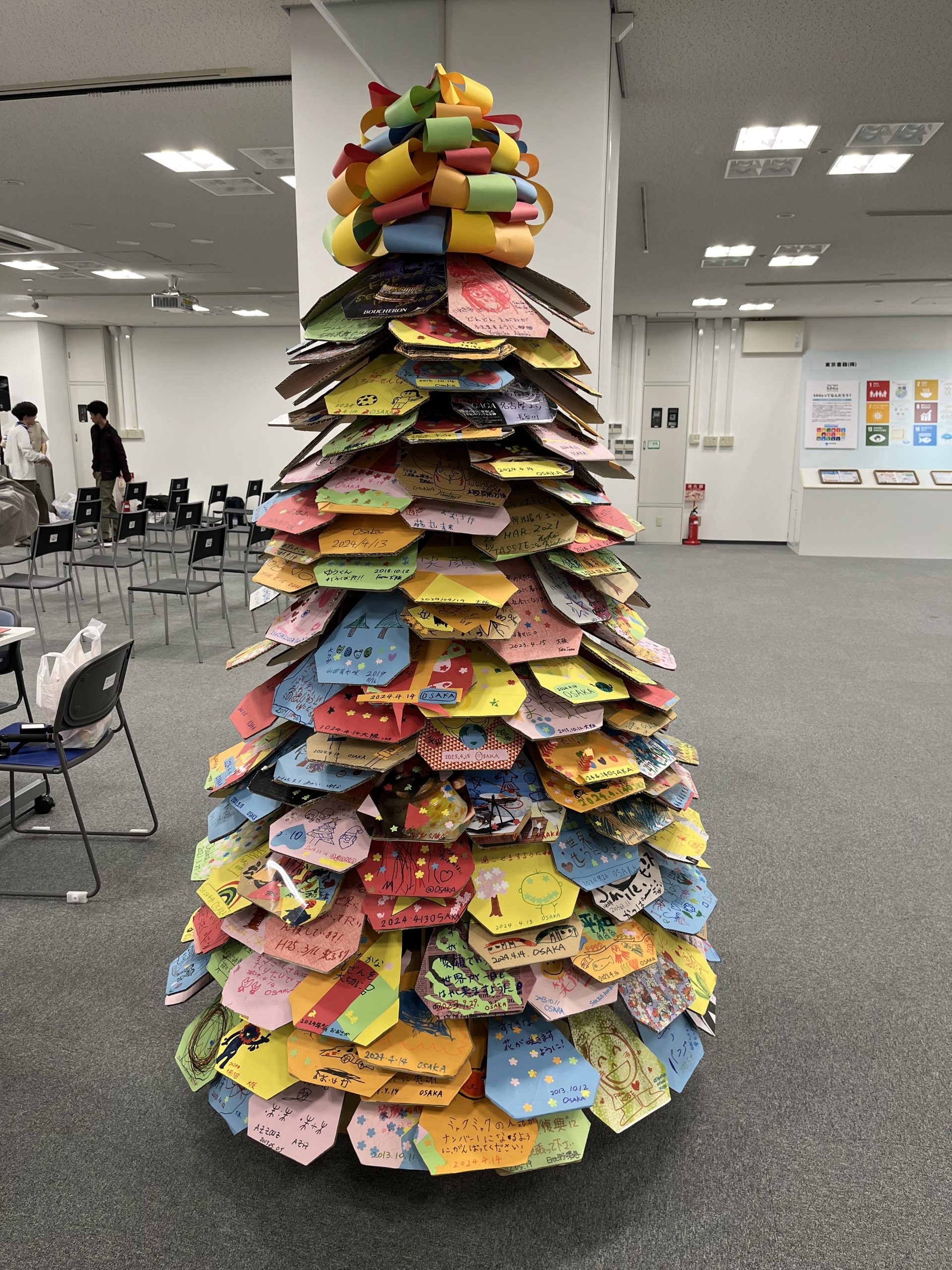 | 内容 | カラフルな紙製の葉っぱに「希望」の想いを記入し、段ボール製の木の幹に差し込み、未来につなげる、 参加型プロジェクトです。 |