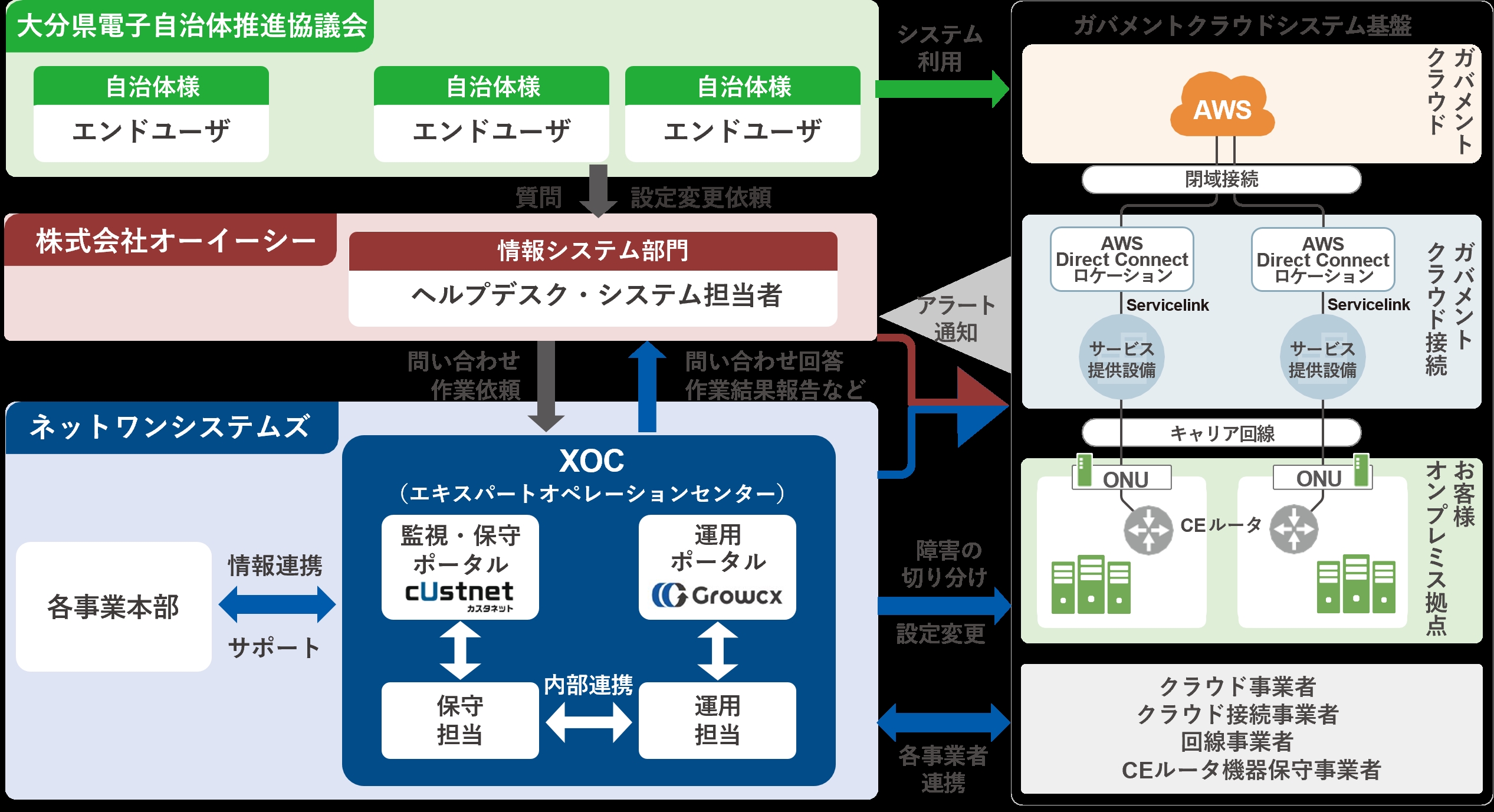 また、大分県内自治体の基幹系システムの運用保守をオーイーシー社が担当していることから、ガバメントクラウド接続向けの運用サービスも、オーイーシー社に問い合わせ窓口を集約する体制を提供します。これにより、障害発生時に、基幹系システムとガバメントクラウド接続について別々に問い合わせをすることなく運用が可能となり、各自治体の担当者に発生する作業や調整事などの業務負荷を削減することができます。