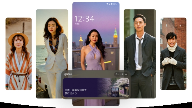Glance社(Glance InMobi Pte Limited)が提供する、米国やインドで好評のAI活用型ECサービス「Glance AI」の機能を、日本のスマートフォンで初めて搭載(※7)。撮影した顔写真から、AIがおすすめする服を着た写真が自動で生成されます。生成される画像は、オンラインファッションストアが提供するリアルタイムデータを元にしており、さまざまな最新スタイルを試す楽しさを味わえます。気に入ったスタイルがあれば、類似したデザインの服を販売するサイトへ簡単にアクセスすることが可能です。また、ロック画面にAIがセレクトした最新のニュースを表示する機能も搭載しています。