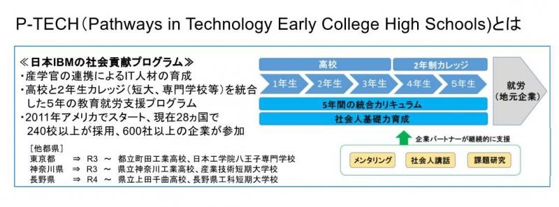 県立高等学校及び県立産業技術短期大学校(IT短大)の5年間を一貫した連携教育プログラム(P-TECH)を実施する。