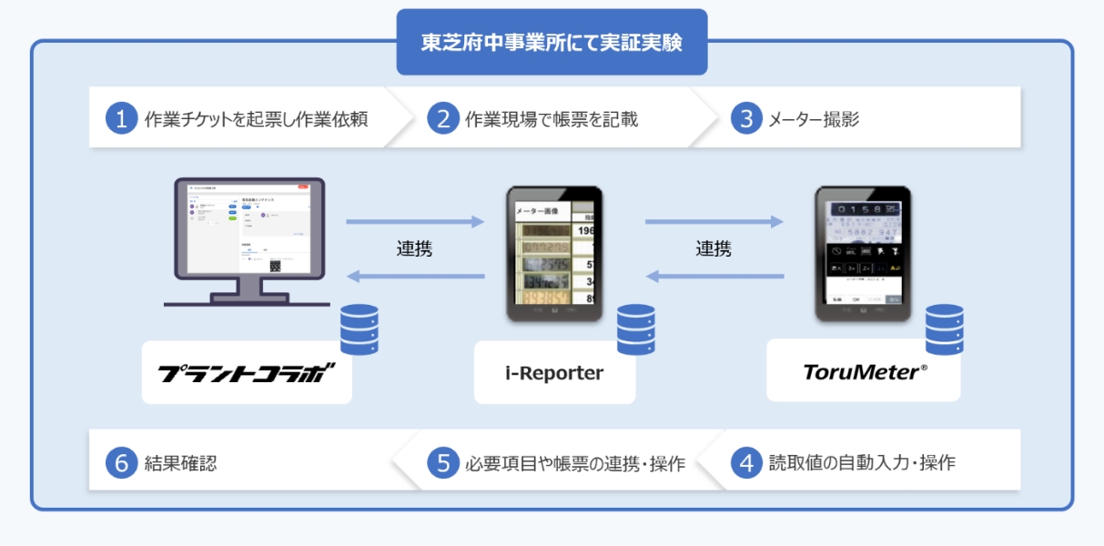 NTTドコモビジネス株式会社(本社:東京都千代田区、代表取締役社長:小島 克重、旧 NTTコミュニケーションズ株式会社、以下 NTTドコモビジネス)、NTTドコモソリューションズ株式会社(本社:東京都港区、代表取締役社長:三ケ尻 哲也、旧 NTTコムウェア株式会社、以下 NTTドコモソリューションズ)、株式会社東芝(本社:東京都港区、代表取締役社長執行役員 CEO:島田 太郎、以下 東芝)は、東芝府中事業所にて、NTTドコモソリューションズが提供する「プラントコラボ※1 」と、東芝が提供する「ToruMeter®※2 」を連携させ、設備の保全・点検業務での人為的ミスの低減や作業の効率化、省人化を図る実証実験(以下 本実証)を実施しました。本実証により、点検作業の業務効率化およびコスト削減の効果を確認しました。この結果をふまえ、工場など現場のDXを実現するサービスの提供を本日より開始しました。