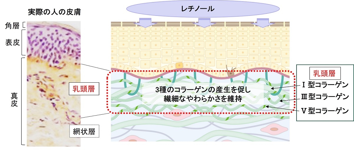 図1 レチノールがⅠ型、Ⅲ型、Ⅴ型コラーゲンの産生を促し 真皮乳頭層の繊細なやわらかさを維持