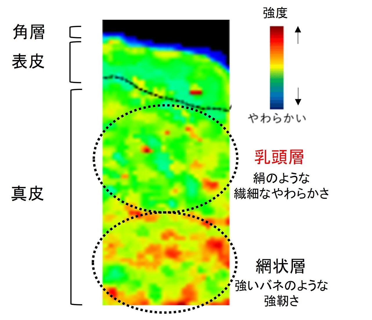 図2 シワのない肌の “肌内部の強度”を独自技術で可視化 真皮の乳頭層と網状層では強度が異なる