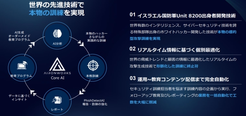 AironWorksのAIメール攻撃訓練サービスは、実際のサイバー攻撃に近い巧妙な攻撃シナリオをAIで自動生成し、形骸化しがちな訓練からの脱却を実現します。対象者の抽出・メール配信・レポート作成など、情報システム部門にとって負荷の高い工程をAIで実行することで、運用負荷を軽減します。さらに、繰り返し訓練を行う中で見えてくる対象者の課題に合わせた訓練内容の提示と、教育コンテンツを提供します。