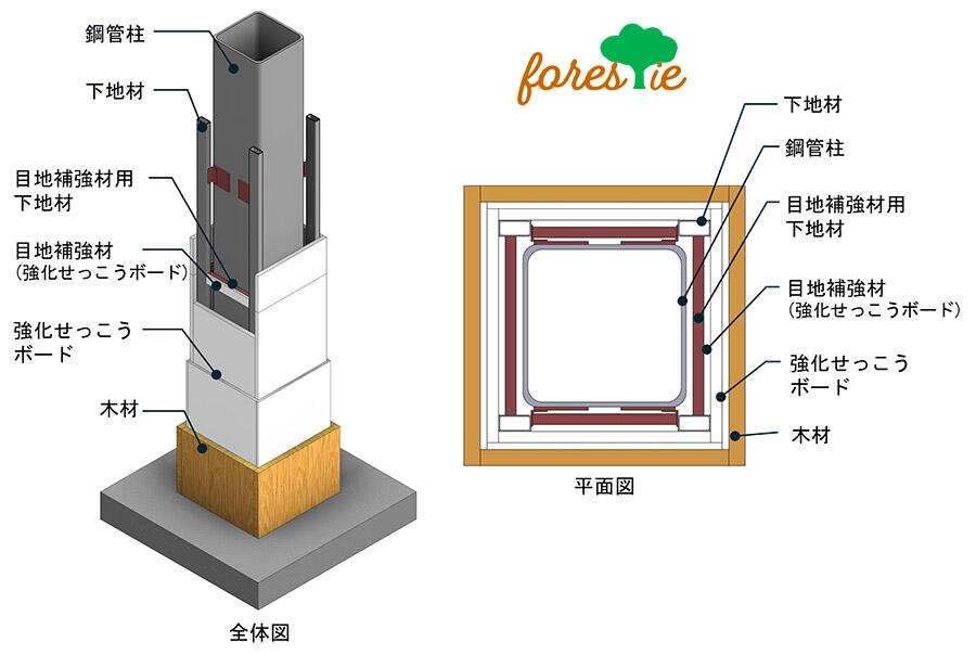 - 1耐火被覆材として、強化せっこうボードと木材を組み合わせ、さらに、強化せっこうボードの横目地部に目地補強材を設けることで、柱外形寸法は、最小で鋼管柱径プラス180mm程度まで薄肉化が可能です。