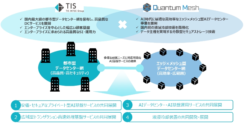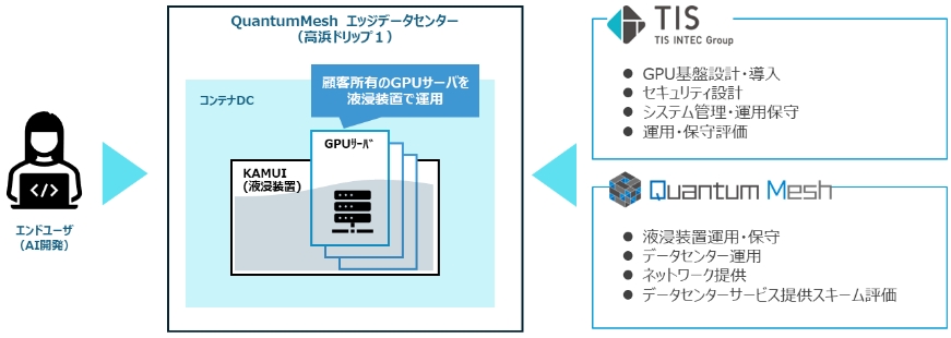 TISインテックグループのTIS株式会社(本社:東京都新宿区、代表取締役社長:岡本 安史、以下:TIS)とQuantum Mesh株式会社(本社:東京都中央区、代表取締役:篠原 裕幸、以下:Quantum Mesh)は、Quantum Meshが提供する分散型エッジデータセンター※1 や液浸冷却システム「KAMUI」を活用したAI基盤サービスの開発・展開を目的とし、2025年10月より協業を開始することを発表します。