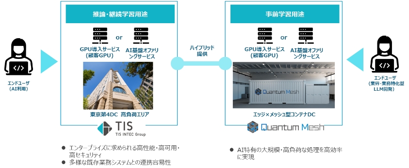 AIを活用したサービスを展開する事業者や社内でのAI活用を検討する事業者、業界・業務特化型AI研究に取り組む事業者向けに、業務効率化や事業展開を支援する高い効率性や利便性を持ったAI基盤サービスの開発を予定しています。また、AIエージェント時代を見据え、セキュアなプライベートAI学習ニーズに対応するため、企業ごとの用途に応じてTISの東京第4データセンターとQuantum Meshの分散型エッジデータセンターをハイブリッドで活用できる体制の構築を目指します。