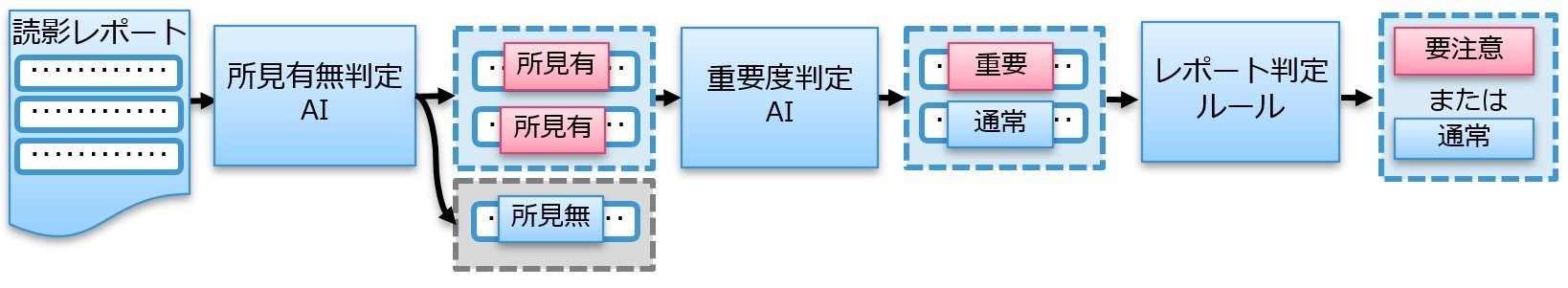 そこでインテックは岩手医科大学と共同で、複数のAIを連携させて読影レポート中の重要所見を判定する手法を開発し、特許出願と学会発表※2 を行いました。AIを導入することで所見の見落としを防ぎつつ、今回開発した手法によって重要所見のみを精度よく判定することが期待できます。本実証実験では、この手法の判定結果の妥当性を実際の読影レポートで評価し、現行システムへの活用を目指しています。