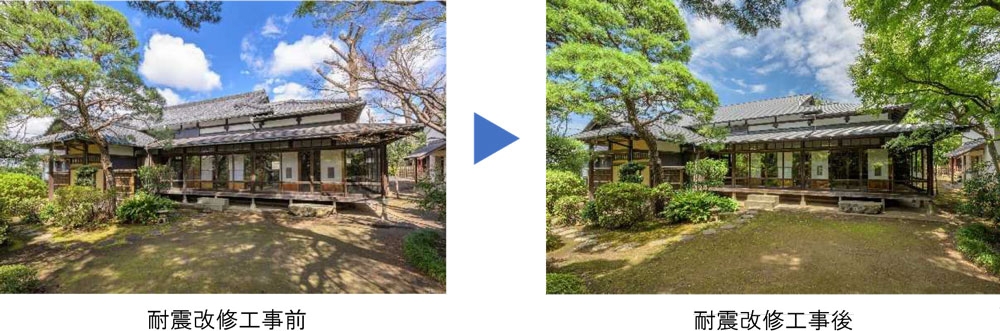 - 屋根材を瓦から金属素材に葺き替えることで建物全体の軽量化を図り、層間変形角※2を1/30以下に抑え揺れを低減。耐震評点を1.0以上に向上させつつ、古民家特有の伝統的な意匠を最大限保存。