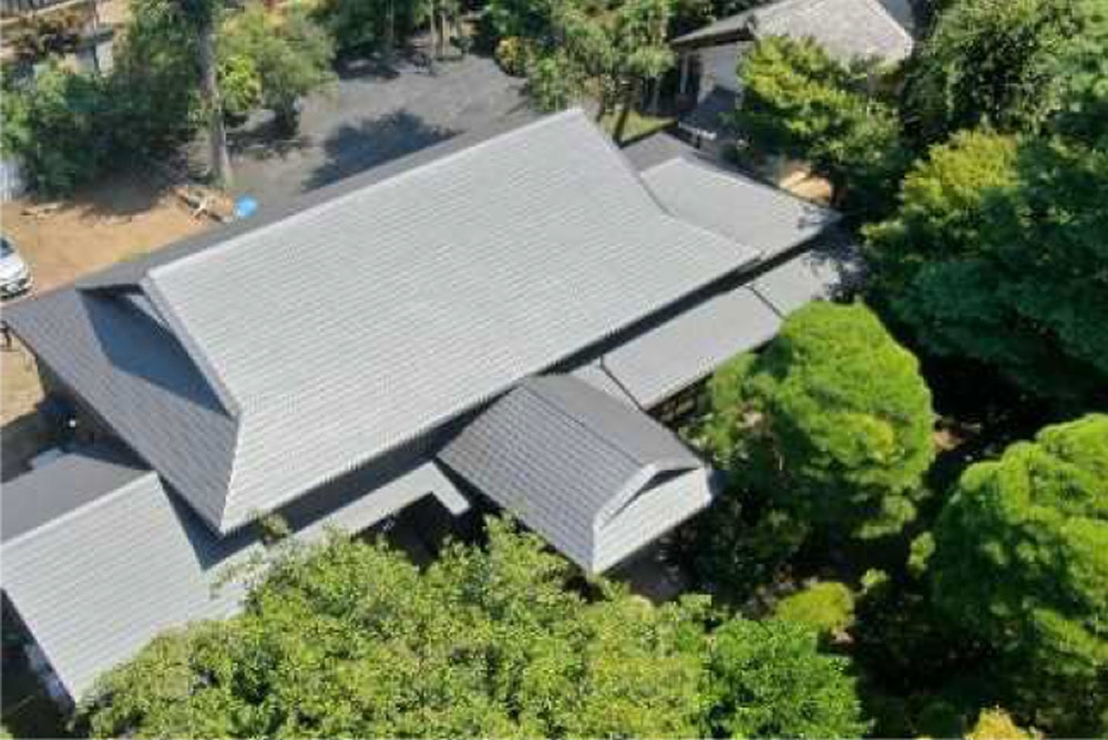 日本家屋における伝統的構法である柔構造の特性上、従来の重い瓦屋根では地震時に建物が揺れやすくなります。本物件では、屋根材を日本瓦から軽い金属素材へ葺き替えることで屋根の総重量を約1/16に抑え、建物全体の軽 量化を図りました。