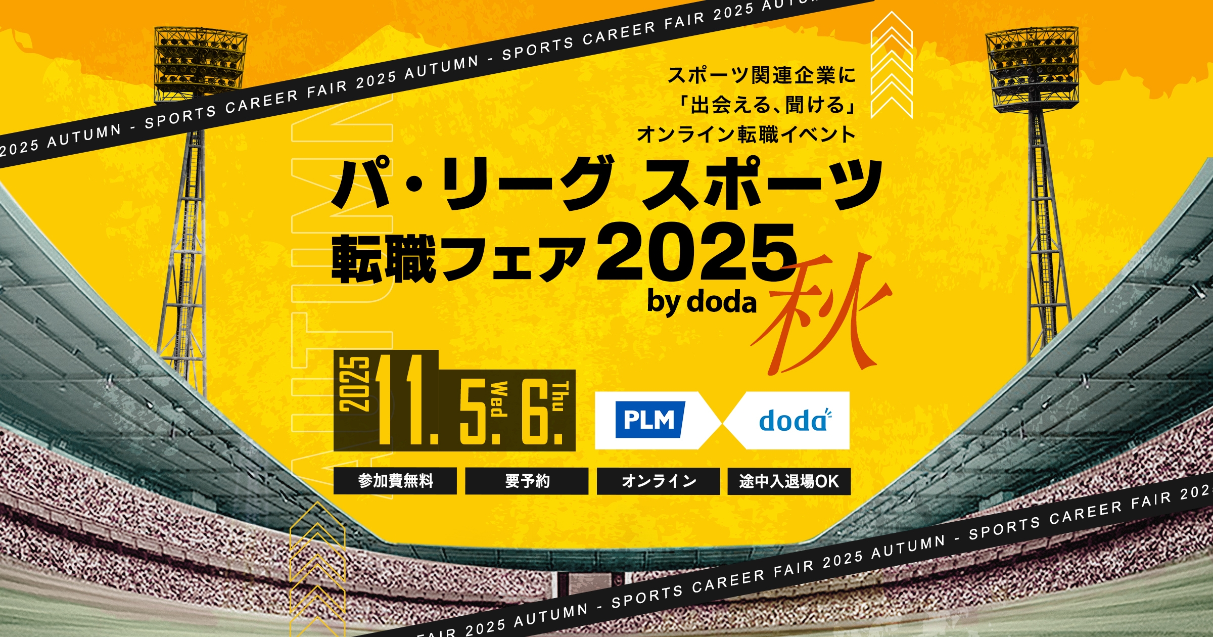 転職サービス「doda」などを提供するパーソルキャリア株式会社(本社:東京都港区、代表取締役社長:瀬野尾 裕)は、パシフィックリーグマーケティング株式会社(本社:東京都港区、代表取締役CEO:新井 仁)と協力し、スポーツビジネスの可能性を知り、キャリアの可能性を広げるイベント「パ・リーグ スポーツ転職フェア2025 秋 by doda」を、2025年11月5日(水)、6日(木)の2日間オンラインで開催することをお知らせいたします。