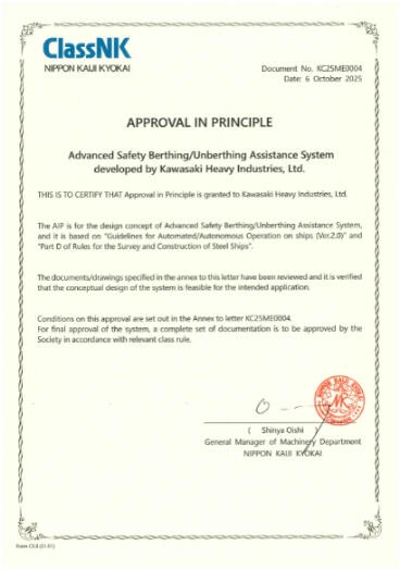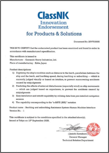 川崎重工は、港湾内における操船・係船の作業効率と安全性向上のために開発した「安全離着岸支援システム」において、一般財団法人日本海事協会(以下ClassNK)から基本設計承認(Approval in Principle、以下「AiP」)と、操船支援情報表示装置に対しては革新技術を対象とした認証サービスInnovation Endorsement(以下「IE」)のP&S認証(P&S:Products & Solutions)を、それぞれ取得しました。また、操船支援情報表示装置はa-SAFE Berthing Support System(以下「a-SAFE(BSS)」)ノーテーション※準拠の第1号製品となります。
