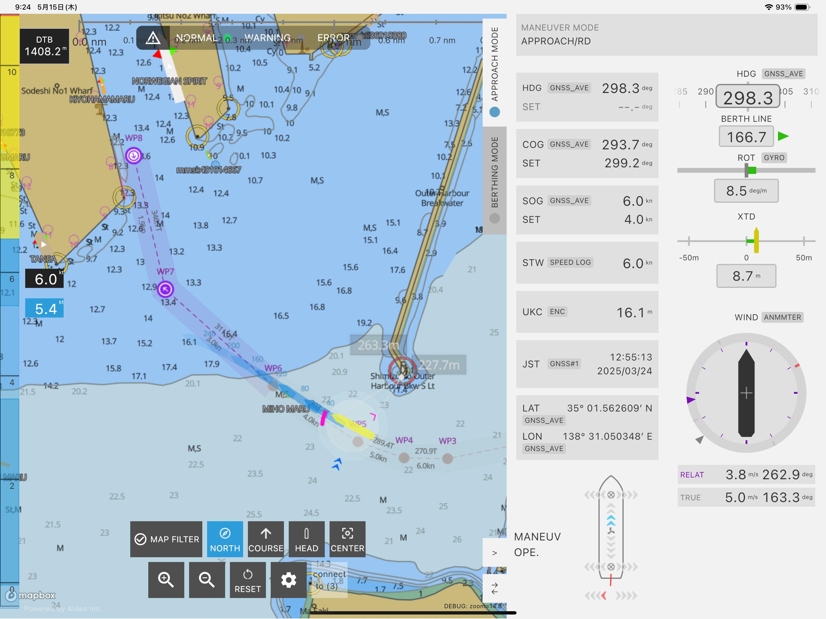 ジョイスティック入力で指示された速度で、計画された航路に沿って船を自動的に航行します。