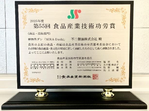 MIRA-Dashi(R)が第55回食品産業技術功労賞を受賞 不二製油株式会社(本社:大阪府泉佐野市、代表取締役社長 最高経営責任者:大森達司、以下当社)の 製造・販売する植物性のダシ「MIRA-Dashi(R)」が、食品産業新聞社主催の「第 55 回 食品産業技術功労賞<商品・技術部門>」を受賞しました。