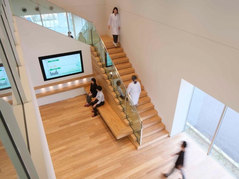 ・壁一面がガラス張りで、当社コア技術「PLGAナノ粒子」 の製造環境をお客様にみていただく「ショールーム」機能も エントランス(吹抜けの階段)