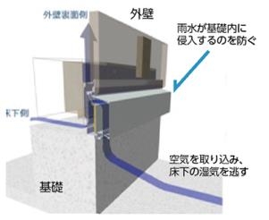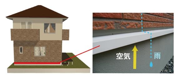 外壁と基礎の間に設けられる水切りで、雨水が基礎内に侵入するのを防ぎます。通気工法ではこの部分から空気を取り込み、壁内の湿気を逃がす通気層の起点にもなります。住宅の外壁と基礎の境界全周に取付けられる建材で、多くの木造住宅に採用されています。ただし、日常では空気を取り組み、湿気を逃す通気口である反面、大雨により水が溜まってくると、床下に水が入ってくる経路になってしまうため、床下浸水被害の大きな原因となります。