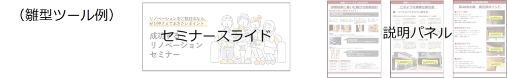 受注には、エンドユーザーにリノベーションの魅力を理解してもらい、かつ自社を最適なリノベーション事業者と認識してもらうことが不可欠です。「リノUP」では、リノベーションがもたらす顧客視点でのメリットと、自社の強みを効果的に伝えるための発信手法やセミナー手法を、雛型ツールとともに加盟店へ提供。受注につながる仕組みづくりを支援します。