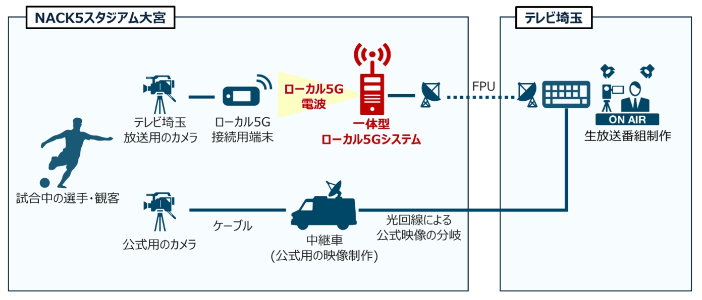 NTT株式会社(以下、NTT)、NTT東日本株式会社(以下、NTT東日本)は、株式会社テレビ埼玉(以下、テレビ埼玉)と、公益社団法人日本プロサッカーリーグ(以下、Jリーグ)協力の元、2025年11月23日(日)にNACK5スタジアム大宮で開催された、「明治安田J2リーグ 第37節 RB大宮アルディージャ vs 徳島ヴォルティス」において、ローカル5Gを活用した高画質・低遅延で安定的な映像伝送によるTV生中継の実証実験を実施し、放送事業者における映像制作現場へのローカル5Gの実用性を確認しました。