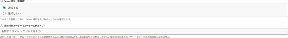 「対象ユーザー(ユーザーとグループ)」欄は Teams 通知(登録時)を「通知する」を選択した時のみ表示されます。