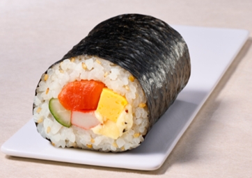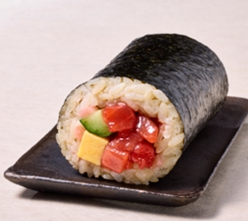 まぐろのたたき・サーモン・海老・飛魚卵・厚焼玉子・きゅうりを中具にした恵方巻です。