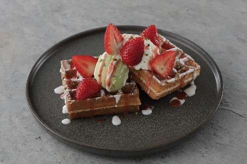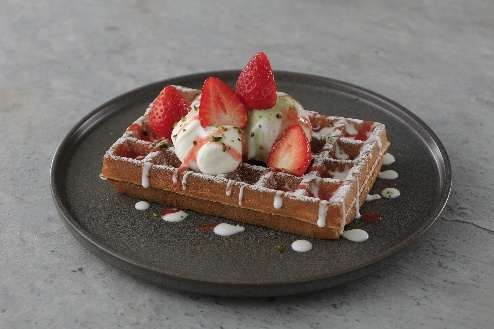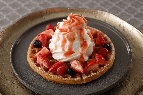 風味豊かなピスタチオアイスに色鮮やかなベリーをトッ ピングした、華やかで贅沢な冬限定のベリーワッフルです。甘酸っぱいいちごの果実に、ブルーベリーとラズベリーで彩りを添え、濃厚なピスタチオアイスとエスプーマホイップをトッピング、果肉入りのいちごソースで仕上げました。サクサクのワッフルにピスタチオアイスがとろけ、いちごのおいしさをより一層引き立てます。