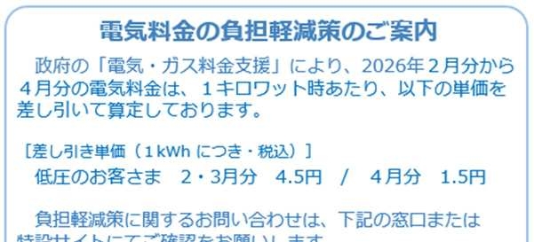 燃料費調整単価から政府が定める上記の単価を差し引くことで電気料金の引き下げを行うとともに、電気料金のご請求書等でもお知らせしてまいります。