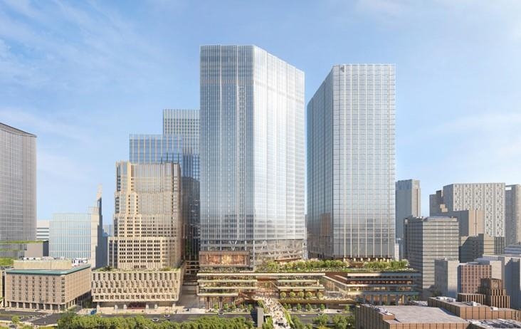 本タワーは、日比谷公園に隣接した北・中・南の 3 地区からなる「内幸町一丁目街区※1」(以下「当街区」)の「中地区」において、オフィス、産業支援施設、ホール、商業、宴会場、ホテルなどの多様な用途から構成される、国内最大級となる延床面積約 36 万㎡の大規模複合施設です。当街区は、大手町・丸の内・有楽町・銀座・霞が関・新橋といった都心主要拠点の結節点に位置しており、その中で中地区は、道路上空公園を介して日比谷公園とウォーカブルにつながります。