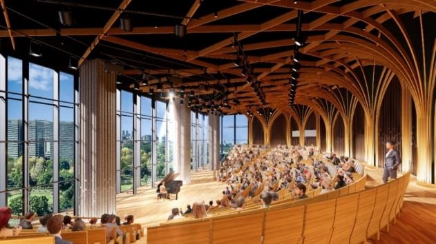 文化発信拠点となるホール(9 階・約 400 席)は、クラシック・ポップスなどのコンサートや、新サービス発表会・講演会などのビジネスシーンでも利用できます。座席からは日比谷公園が一望でき、ここでしか体験できない空間・時間を提供します。ホワイエには、「NTT 日比谷ビル」の特徴であった泰山タイルを再利用し、この場所の歴史を感じさせるデザインとします。