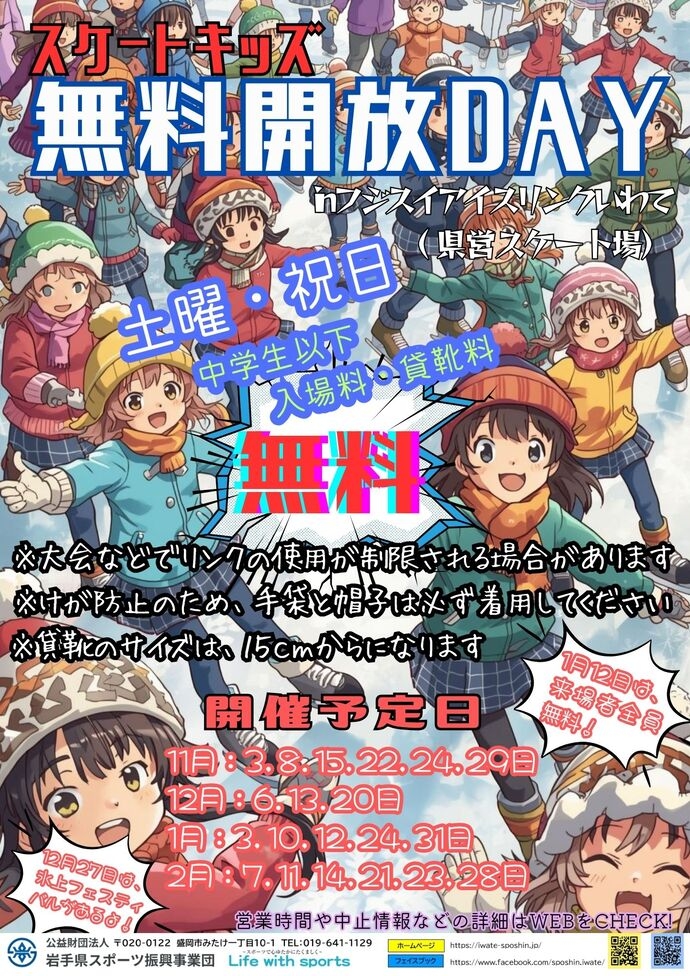 岩手県営スケート場では11月から2月まで、土曜日と祝日に中学生以下の方を対象に無料開放しております。